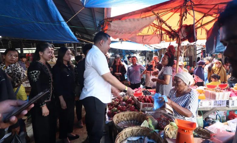 Franc Bernhard Tumanggor menyapa pengunjung pasar, berdialog dengan para pedagang, serta membayar nilai barang belanja masyarakat yang dia temui.