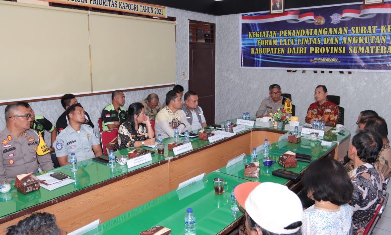 SINDEKA.id – Penjabat (Pj) Bupati Dairi, Surung Charles Bantjin bersama Kapolres Dairi AKBP Agus Bahari dan instansi terkait mengikuti kegiatan penandatanganan serentak surat keputusan Forum Lalu Lintas dan Angkutan Jalan (FLLAJ) Kabupaten Dairi Provinsi Sumatera Utara di Ruang Rapat Utama Polres Dairi, Kamis (30/5/2024).