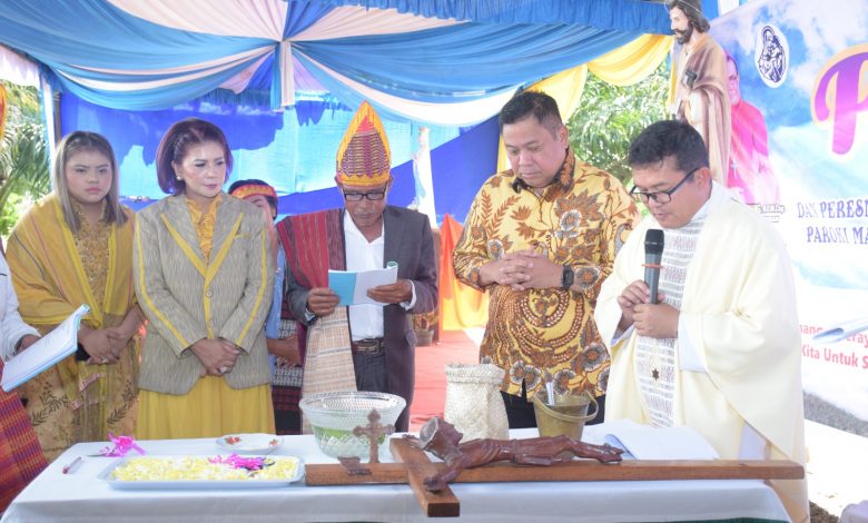 SINDEKA.id – Bupati Dairi Eddy Keleng Ate Berutu bersama istri Romy Mariani dan pastor Romo Pinto Hasugian meresmikan gedung baru Gereja Katolik Santo Anselmus, Desa Gunung Meriah, Dusun Sikaharung, Kecamatan Siempat Nempu Hulu, Kabupaten Dairi, Minggu (23/4/2023).