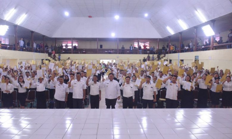 SINDEKA.id – Bupati Dairi Dr Eddy Keleng Ate Berutu menyerahkan SK Pengangkatan Pegawai Pemerintah Dengan Perjanjian Kerja (P3K) Formasi Tahun 2021 bertempat di Gedung Olah Raga (GOR) Sidikalang, Rabu (29/06/2022). Sebanyak 375 orang pegawai pemerintah dengan perjanjian kerja formasi tahun 2021 resmi menerima SK Pegawai Pemerintah Dengan Perjanjian Kerja (PPPK) di lingkungan pemerintah Kabupaten Dairi yang terdiri dari tenaga guru yang merupakan eks honorer kategori 2, guru non ASN yang terdaftar d Dapodik, Guru Swasta yang terdaftar di Dapodik dan lulusan PPG yang sudah melalui tahapan seleksi sejak awal Juli 2021 lalu.