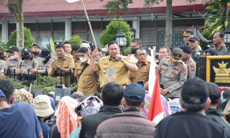 SINDEKA.id – Bupati Eddy Berutu menemui pengunjukrasa yang mengatasnamakan Aliansi Petani Dairi untuk Keadilan (APUK) di depan kantor Bupati, Selasa (1/11/2022).